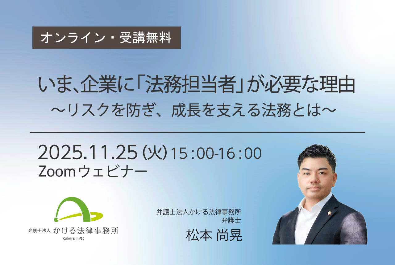 【終了】<セミナー>【オンライン11/25開催】「いま、企業に「法務担当者」が必要な理由 ~リスクを防ぎ、成長を支える法務とは~」