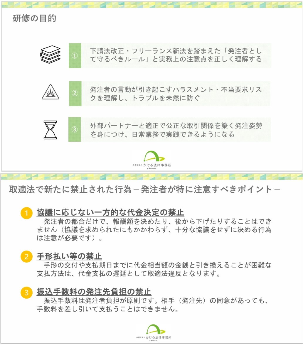 当事務所では、今後も企業の実情に即した実践的な研修・セミナーを通じて、企業の皆様にとって健全な取引環境づくりを支援してまいります。